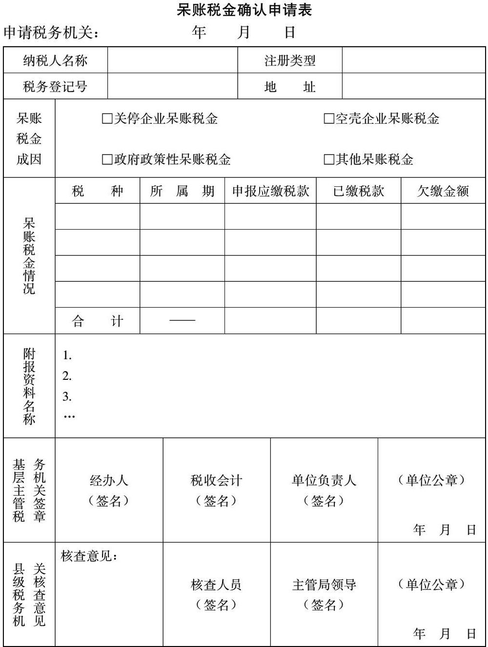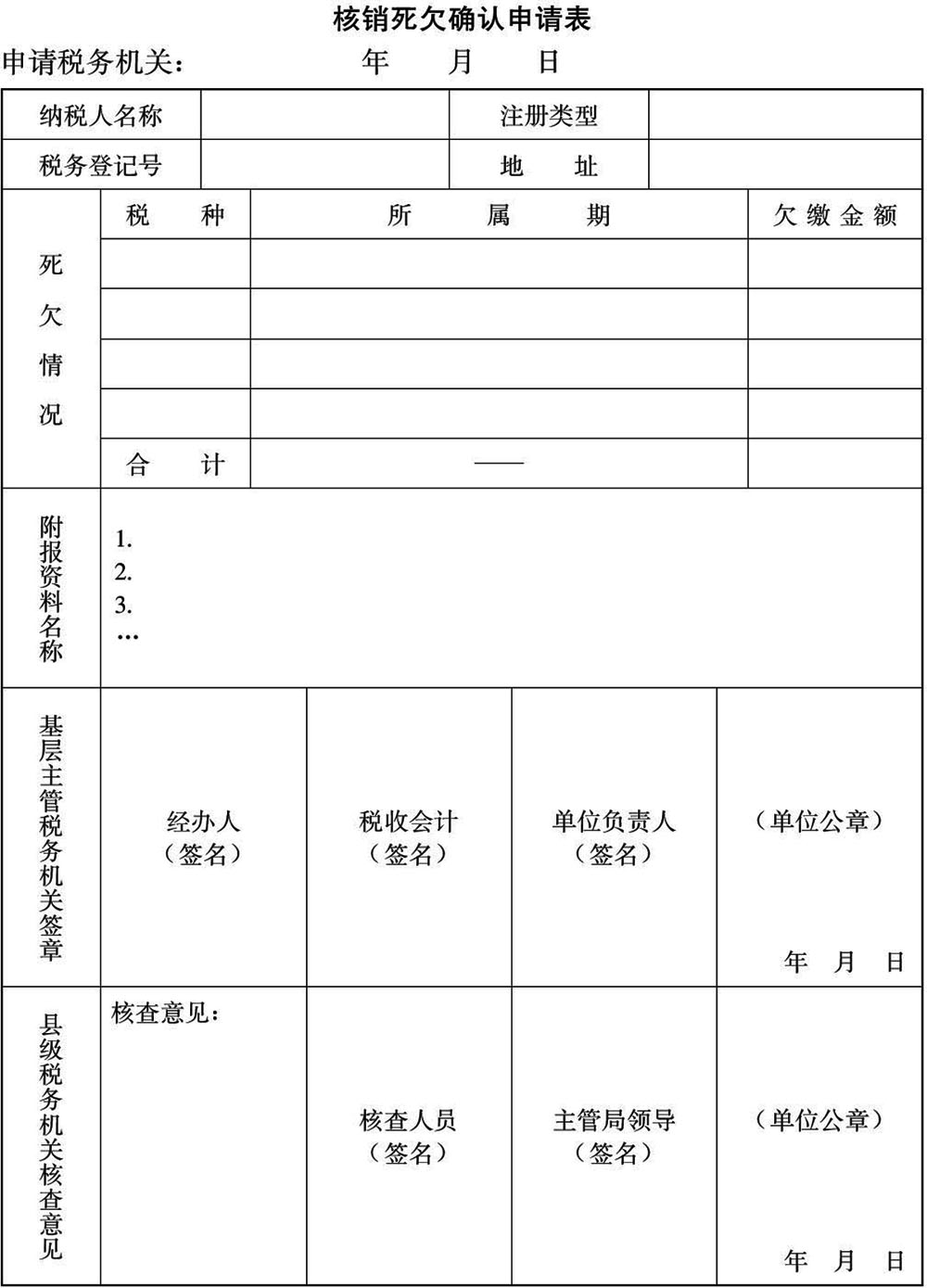 (一)申请确认呆账税金和核销死欠必须由基层主管税务机关填报“呆账税金确认申请表”(格式见附件一)或“核销死欠确认申请表”(格式见附件二),并按以下要求附报有关申请材料(申请材料必须一式两份:一份逐级报确认机关,并由确认机关负责确认工作的主管部门留存;一份报县级税务机关,待确认机关核准后再退回基层主管税务机关):