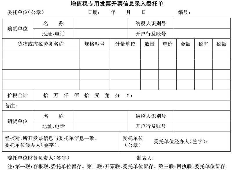 第十二条 中介机构和税务机关要严格按照纳税人提供的《增值税专用发票开票信息录入委托单》(样式附后)录入开票信息。已开具专用发票的《增值税专用发票开票信息录入委托单》由中介机构和税务机关按专用发票的保管年限保存。