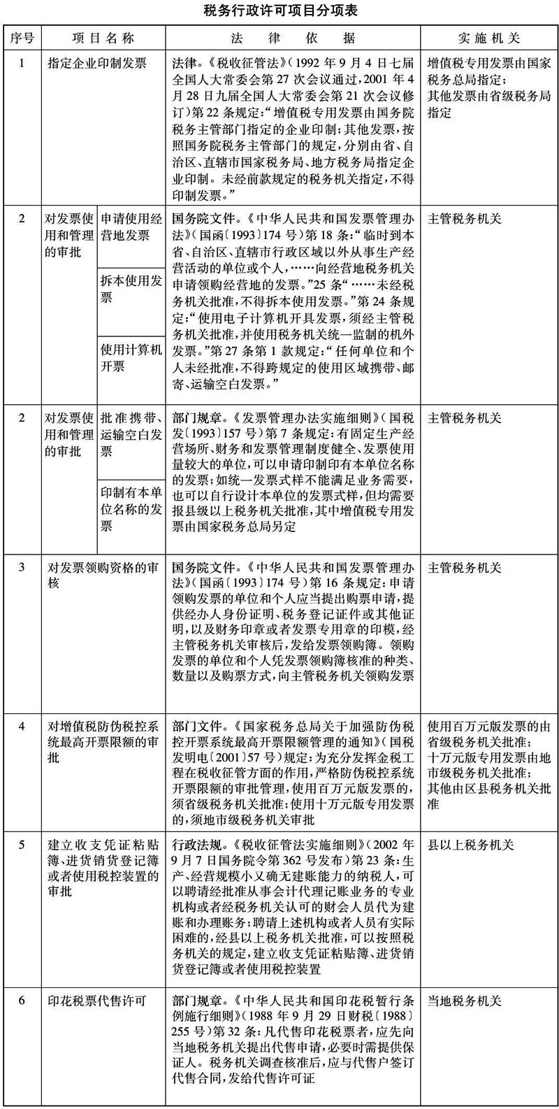 (一)经国务院确认,税务行政许可包括:指定企业印制发票;对发票使用和管理的审批;对发票领购资格的审核;对增值税防伪税控系统最高开票限额的审批;建立收支凭证粘贴簿、进货销货登记簿或者使用税控装置的审批;印花税票代售许可。