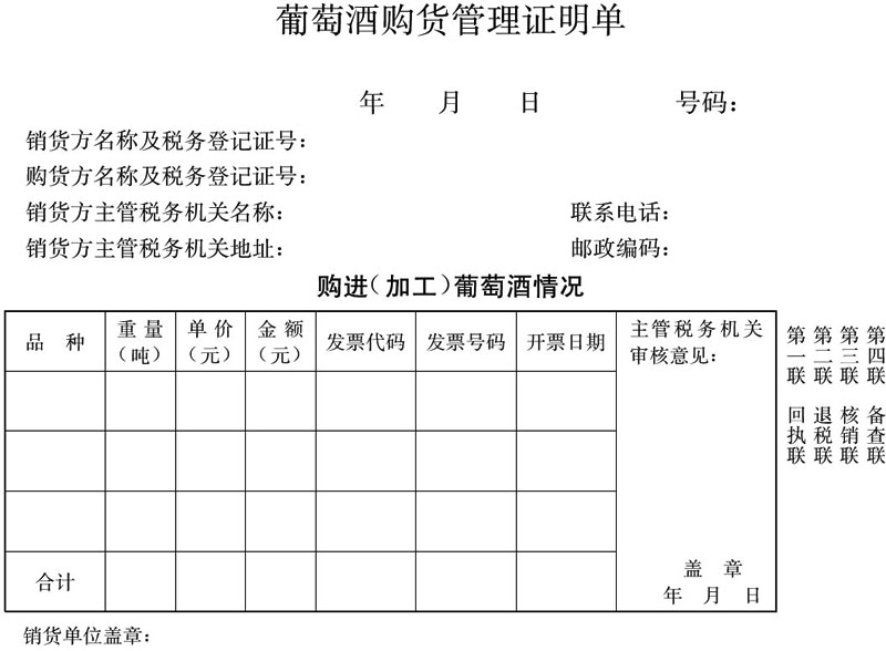 第四条 境内从事葡萄酒生产的单位或个人(以下简称生产企业)之间销售葡萄酒,实行《葡萄酒购货证明单》(以下简称证明单,见附件1)管理。证明单由购货方在购货前向其主管税务机关申请领用,销货方凭证明单的退税联向其主管税务机关申请已纳消费税退税。