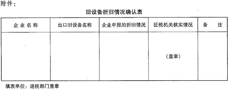 企业以实物投资出境的自用旧设备,须按照《中华人民共和国企业所得税条例》规定的向主管税务机关备案的折旧年限计算提取折旧,并计算设备折余价值。税务机关接到企业出口自用旧设备的退税申报后,须填写《旧设备折旧情况核实表》(见附件)交由负责企业所得税管理的税务机关核实无误后办理退税。