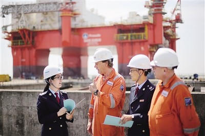 近日,国家税务总局启东市税务局干部走进寅阳镇海工船舶工业园区调研,向园区内的纳税人宣传、解读新近出台的各项税收政策。图为税务干部向中远海运重工有限公司的外籍工程师讲解个人所得税相关政策。