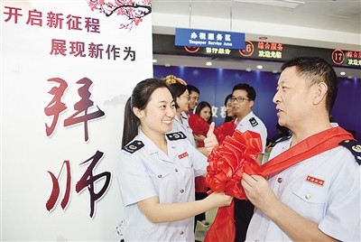 近日,南京市栖霞经济技术开发区税务部门开展“拜师”系列活动,通过组织一线税务人员跨岗位传帮带,实现“一岗多能”,打造涉税业务“一厅通办”的工匠型人才。图为税务师徒相聚办税服务厅举办“拜师”活动。
