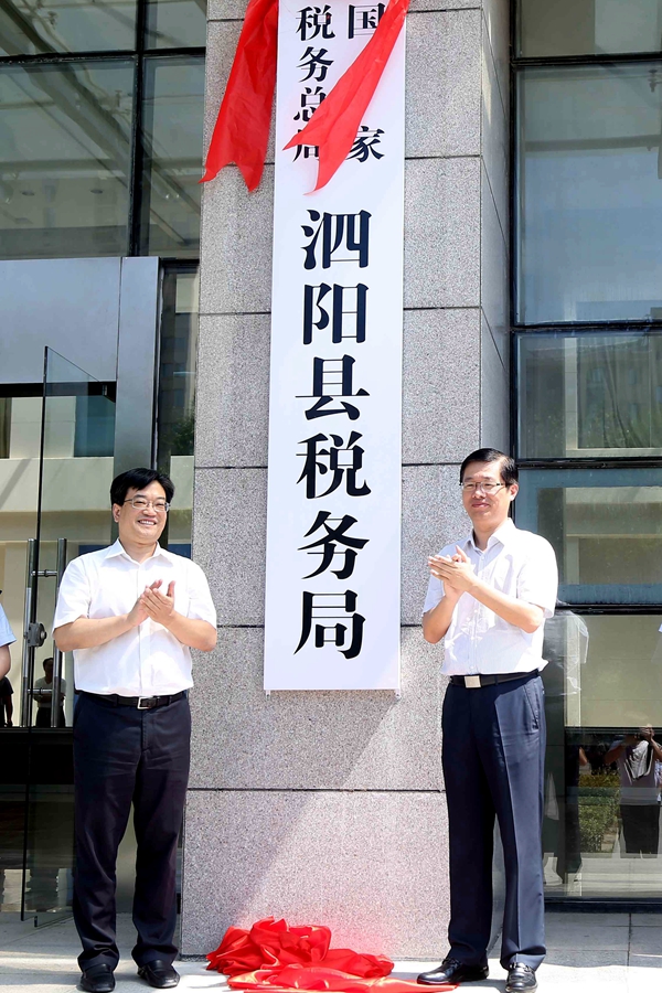 国家税务总局江苏省税务局联合党委委员、纪检组长郑力坚(国家税务总局江苏省税务局第10联络督导组组长)和宿迁市委常委、常务副市长沈海斌共同为国家税务总局泗阳县税务局揭牌。国家税务总局江苏省税务局第10联络(督导)组常务副组长韩爱国,国家税务总局宿迁市税务局联合党委书记、局长王月明,泗阳县委书记徐勤忠,国家税务总局宿迁市税务局联合党委委员、总会计师曹崇谦,泗阳县委常委、常务副县长李民富出席泗阳挂牌仪式。