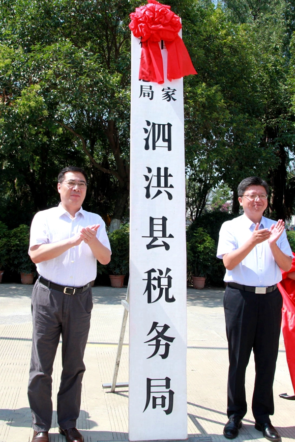 泗洪县委书记王晓东和国家税务总局宿迁市税务局联合党委委员、副局长董长春共同为国家税务总局泗洪县税务局揭牌。国家税务总局宿迁市税务局党委委员、副局长郑山出席挂牌仪式并致辞。
