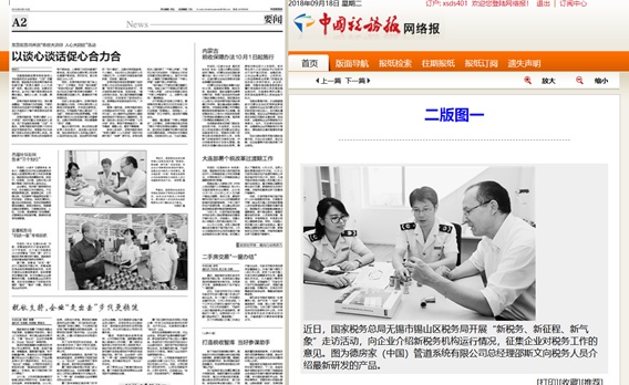 近日,国家税务总局无锡市锡山区税务局开展“新税务、新征程、新气象”走访活动,向企业介绍新税务机构运行情况,征集企业对税务工作的意见。图为德房家(中国)管道系统有限公司总经理邵斯文向税务人员介绍最新研发的产品。