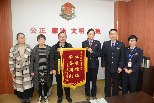 近日,常熟市恒泰医药连锁有限公司的企业负责人、财务人员一行四人,来到常熟经开区税务局,送上了一面“业务精湛、服务周到”的锦旗,为该局优质高效便捷的纳税服务点赞。