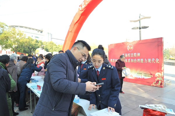 今天是全国第六个国家宪法日。镇江市司法局、普法办在西津渡鉴园广场举办“12·4”国家宪法日暨宪法宣传周主题活动。润州区税务局干部走进活动现场,进行税收普法宣传,宣讲减税降费新政,解答个税新政咨询。同日,丹阳市税务局也参加了丹阳市宪法日广场活动。