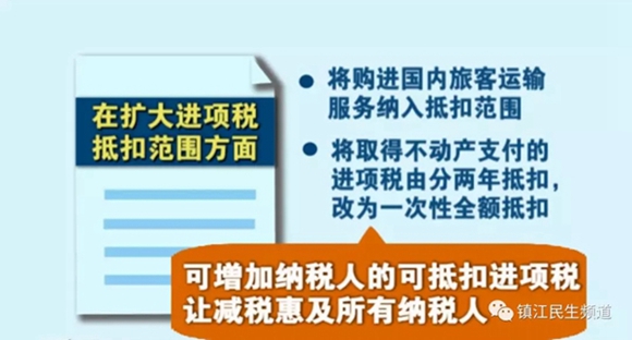 在扩大进项税抵扣范围方面,将购进国内旅客运输服务纳入抵扣范围,将取得不动产支付的进项税由分两年抵扣,改为一次性全额抵扣,这两项措施可增加纳税人的可抵扣进项税,让减税惠及所有纳税人。