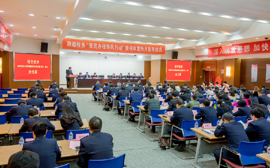 4月3日, 国家税务总局南通市税务局举办2019年“便民办税春风行动”暨第28个税收宣传月活动发布仪式。市局党委委员、副局长常永涛主持仪式,市工商联、市银保监分局等部门、行业商会、企业、银行业、涉税志愿团队、“税悦江海”志愿宣传队和新闻媒体代表,各县(市、区)税务局、市区各区局、派出机构主要负责人,局相关科室代表120余人参加发布仪式。