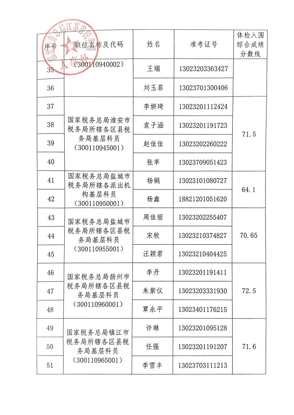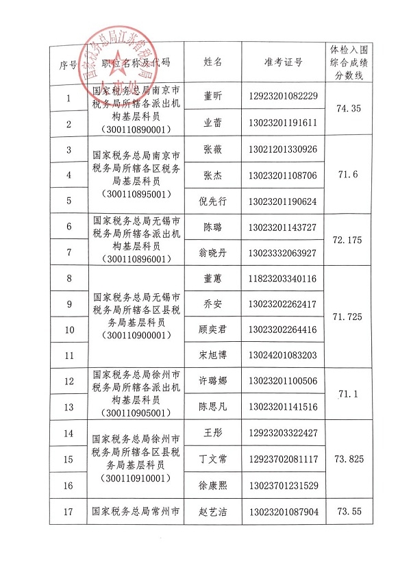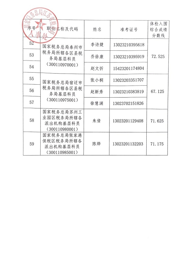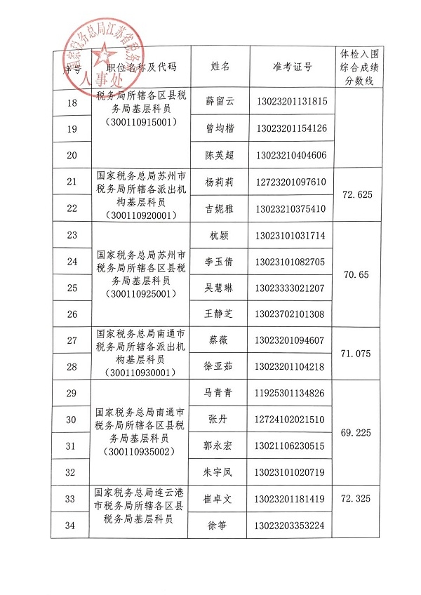 国家税务总局江苏省税务局系统2019年补充录用公务员体检入围人员名单