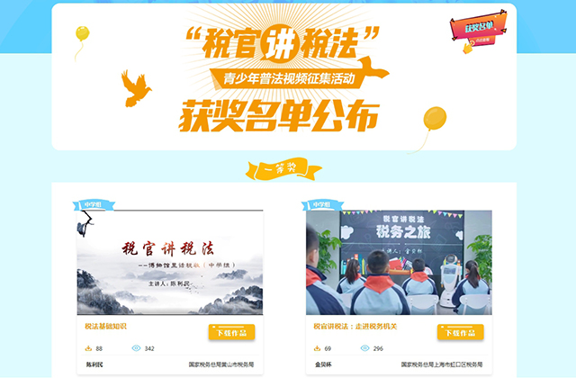 征集优秀作品,针对受众创作。为丰富青少年税法教育资源,税务总局于2019年举办了首届“税官讲税法”青少年普法视频征集活动,共收到来自全国28个省(区、市)推荐的50余部视频作品,获奖作品在“税法学堂”进行专题展播。视频分小学、中学两组,针对不同年龄段学生的认知水平和理解能力“量身定制”,让青少年听得懂、学得透、印象深。