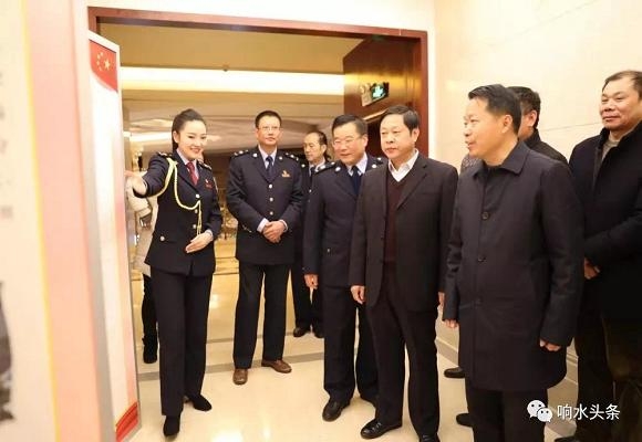 响水县委常委、宣传部长李运连,盐城市税务局党委副书记、副局长苏延法一行参观展板