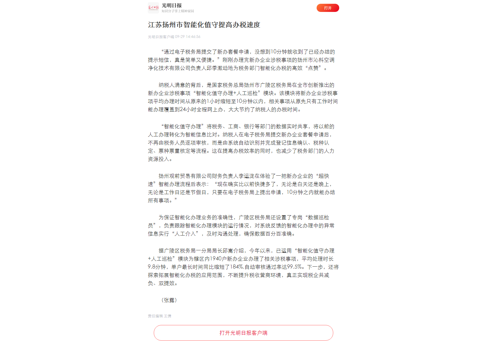 《光明日报》(客户端):江苏扬州市智能化值守提高办税速度