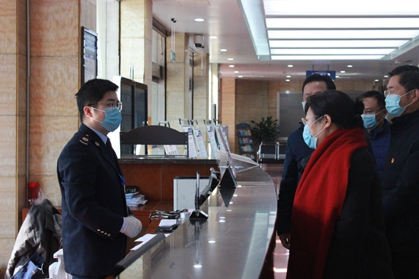 2月10日上午,市局党委书记、局长杨洁采取“四不两直”的方式,检查邗江区局办税服务厅防疫工作和日常运行管理情况。市局党委委员、总会计师张耀斌,市局纳税服务科科长吴小虎陪同检查。