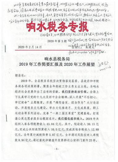 国家税务总局响水县税务局2019年工作汇报及2020年工作展望获得副市长、县委书记和县长肯定批示