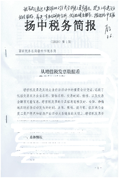 “税务局通过大数据比对方式分析复工复产情况,提出工作建议的做法很好,希进一步加大研判分析,做好暖企服务,推动扬中发展。”日前,扬中市委书记殷敏如是批示扬中市税务局报送的税收分析报告《从增值税发票数据看我市复工复产成效明显》,市长张德军也高度肯定了该局服务发展工作,极大鼓舞了全局干部职工。