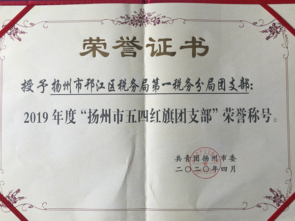 近日,邗江区局一分局团支部被共青团扬州市委授予“扬州市五四红旗团支部”称号。