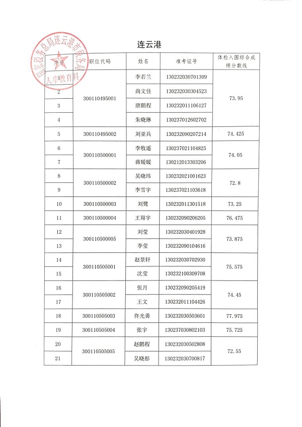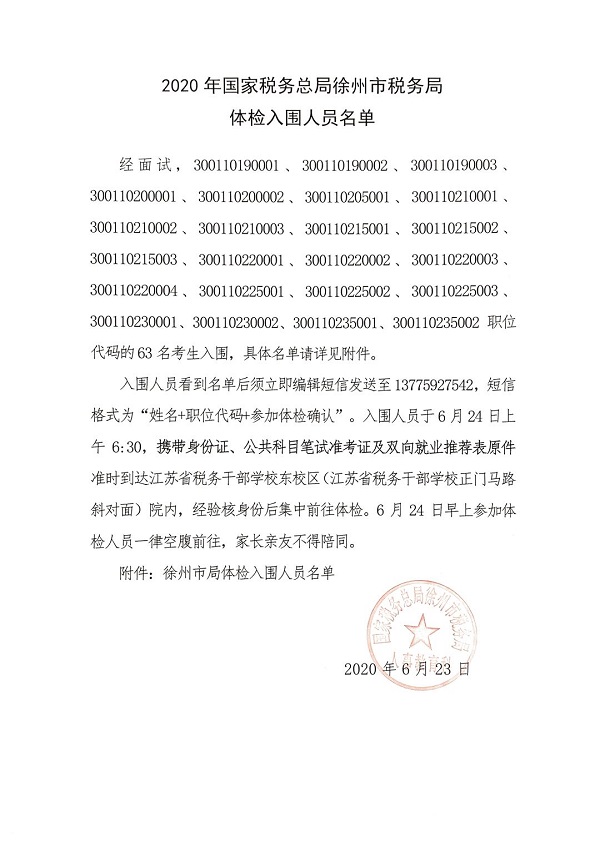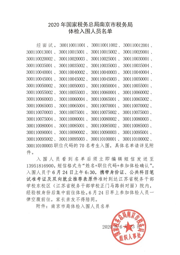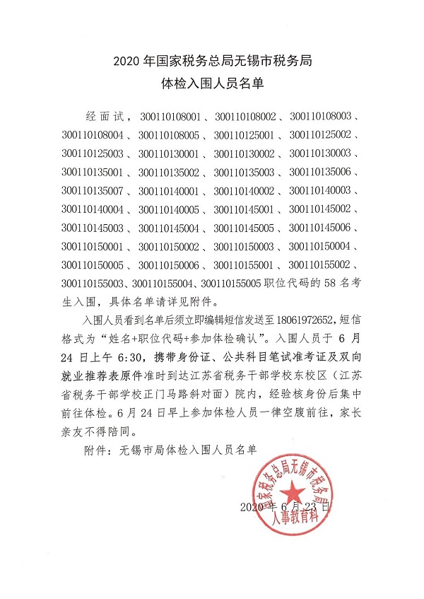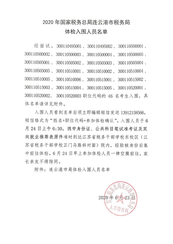 2020年国家税务总局江苏省税务局考试录用公务员6月23日面试体检入围人员名单公布如下,请入围人员认真阅读注意事项。公布期为6月23日-6月25日。