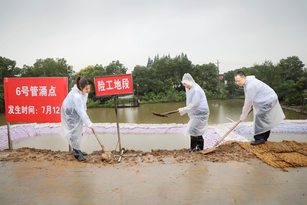 防汛就是命令,救灾就是责任。丹徒税务的党员干部还参加了江心洲的巡堤排险工作。他们身披雨衣,脚穿雨靴,巡查管涌点,预防管涌处。发现管涌点,他们就挖淤泥,填石块,“盖”、“压”并举,排除险情。“江心洲位于长江下游排洪必经险段,是防汛最严峻的地段之一,是我们丹徒防汛重点地区”。正在江心洲五墩村管涌点抢险的丹徒税务“党员防汛抗洪突击队”的殷亚军介绍说。