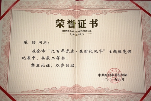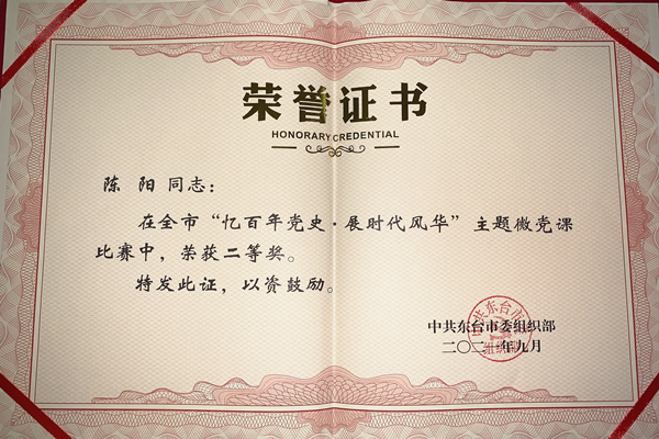 近日,东台市税务局一分局青年干部陈阳同志的《以诚心、公心和恒心践行为民服务宗旨》微党课,在东台市委组织部举办的“忆百年党史·展时代风华”主题微党课比赛中荣获二等奖。