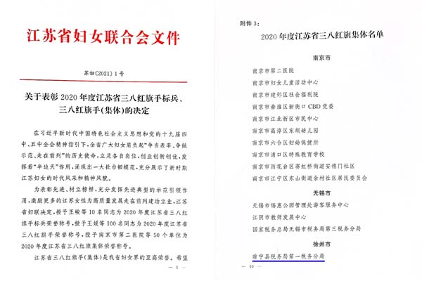 近日,江苏妇联公布了2020年度江苏省三八红旗集体名单,国家税务总局睢宁县税务局第一税务分局作为全市仅有的三家集体之一,荣获“江苏省三八红旗集体”称号。