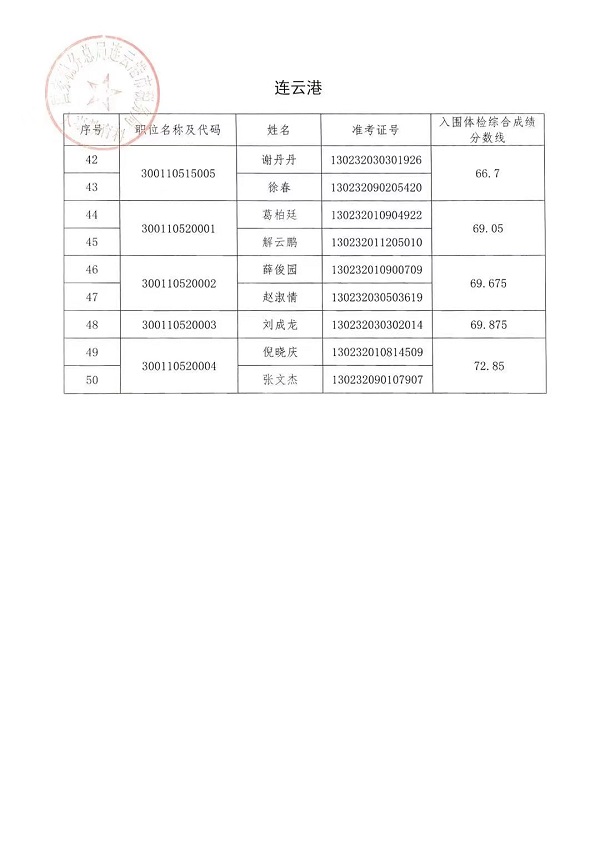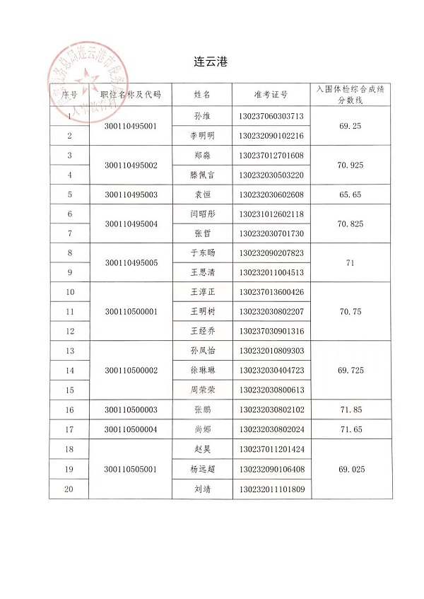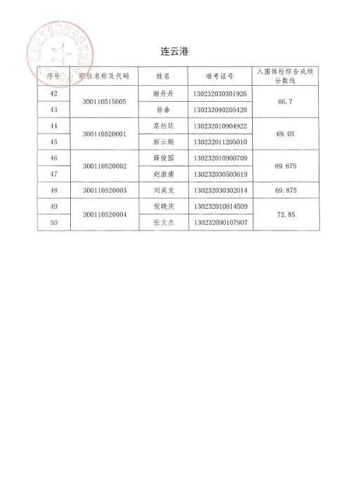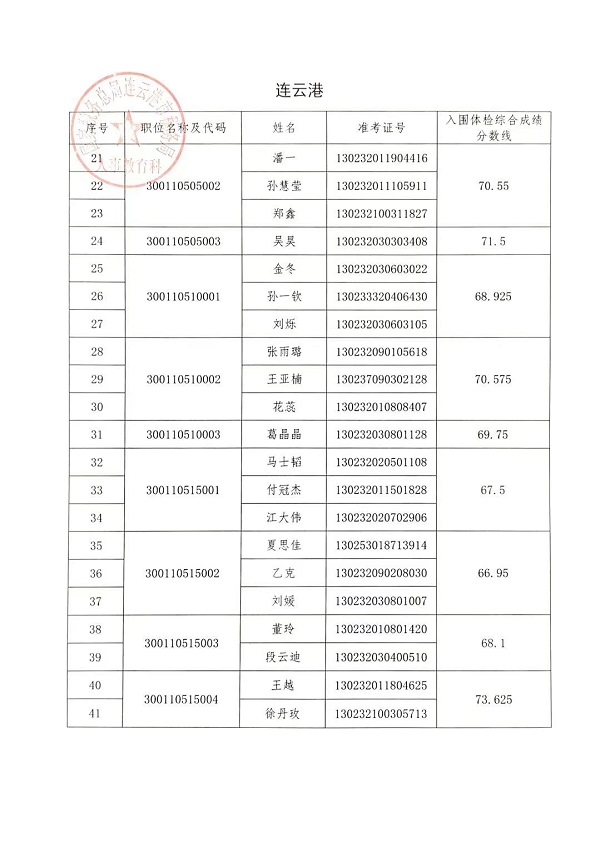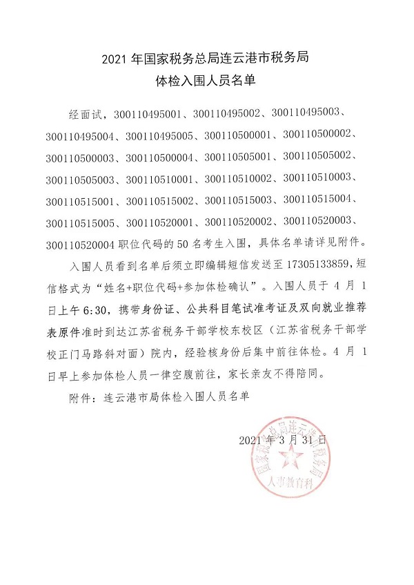 国家税务总局江苏省税务局2021年度考试录用公务员3月31日面试体检入围人员名单(连云港)公布如下,请体检入围人员认真阅读注意事项。