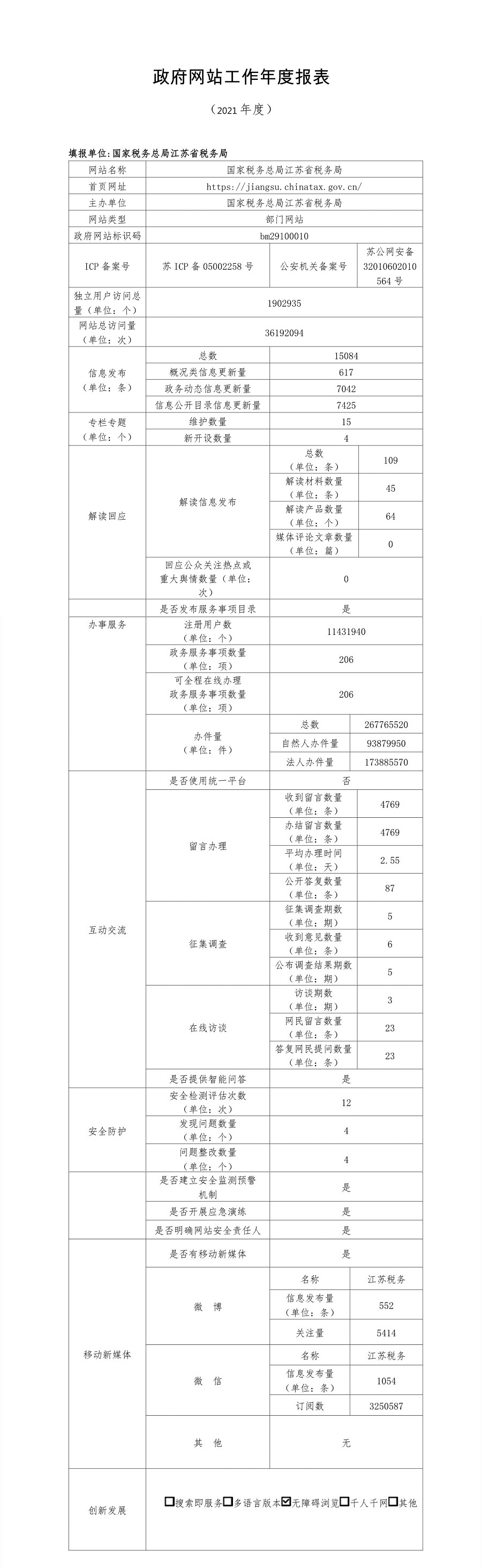 2021年国家税务总局江苏省税务局政府网站工作年度报表