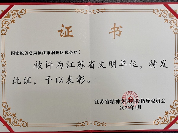 近日,江苏省精神文明建设指导委员会对2019-2021年度江苏省文明村镇、文明单位、文明校园、文明行业进行表彰,市委市政府对2018—2020年度市文明行业、文明单位文明社区、文明校园、文明镇文明村进行表彰。国家税务总局镇江市润州区税务局喜获“江苏省文明单位”、“镇江市文明单位”荣誉称号。