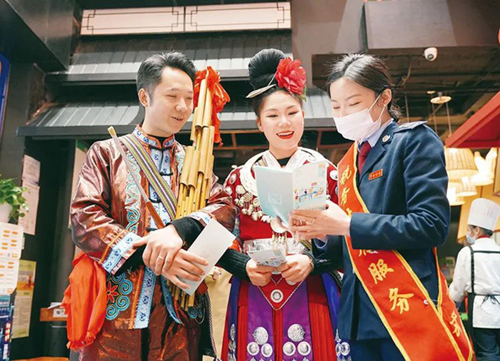 今年以来,税务部门优化实施小规模纳税人减征增值税、小微企业和个体工商户减征所得税等一批覆盖面更广的政策,突出对小微企业、个体工商户的支持。图为2023年3月16日,国家税务总局贵阳市南明区税务局干部走进当地国家非遗项目酸汤鱼餐饮店,讲解税收优惠政策。 国家税务总局供图 梁诗茂/摄