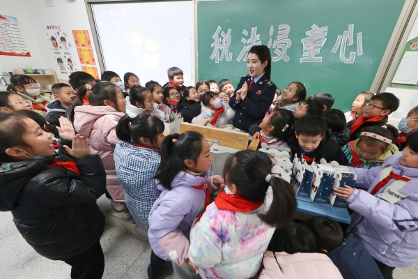国家税务总局金湖县税务局近日以“新年第一课 税法进校园”为主题,走进吴运铎实验小学开展“税收普法进校园”活动。图为税务局工作人员为孩子们带来别开生面的“税法第一课”。