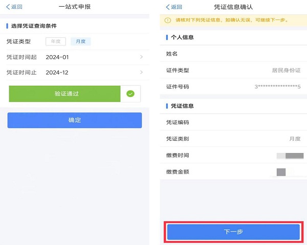 打开【个人所得税 APP】,选择【办&查】—【个人养老金扣除管理】—【“一站式”申报(免下载凭证)】,开启一站式申报。进入一站式申报页面后,选择【凭证类型】和【凭证时间】,滑动验证条,点击【确定】,查询本人的个人养老金缴费凭证信息。对凭证信息确认无误后,点击【下一步】。