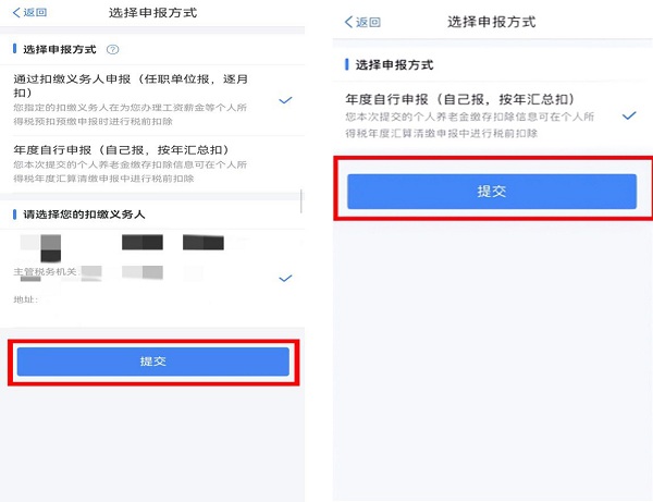 扣除凭证信息确认后,进入选择申报方式页面。若您凭证类型是“月度”,则您可以选择【通过扣缴义务人申报】或【年度自行申报】;若凭证类型是“年度”,则您仅可选择【年度自行申报】。其中,选择【扣缴义务人申报】的,您还需选择相应的扣缴义务人。选择申报方式后,点击【提交】即完成了申报流程。