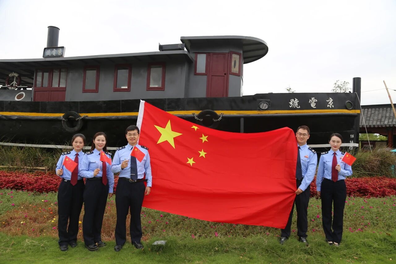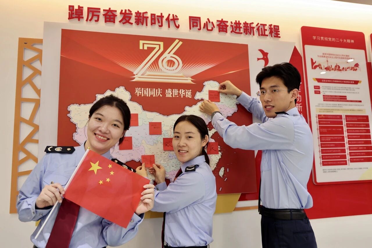 为庆祝中华人民共和国成立76周年,江苏各地税务干部通过多种方式与国旗同框,喜迎国庆。