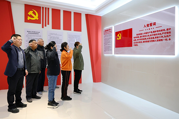 在税务分校的党建活动区,鲜红的党旗格外醒目,入党誓词庄严神圣,党史书籍整齐摆放。这里,是老干部们重温初心、汲取力量的“红色港湾”。为确保学习教育“一个不落”,盐城市税务局创新打造“线上+线下”双轨学习模式,通过“流金税月”微信群定期推送学习资料,对行动不便的老同志开展“送学上门”,让党的创新理论“飞入寻常银发家”。
