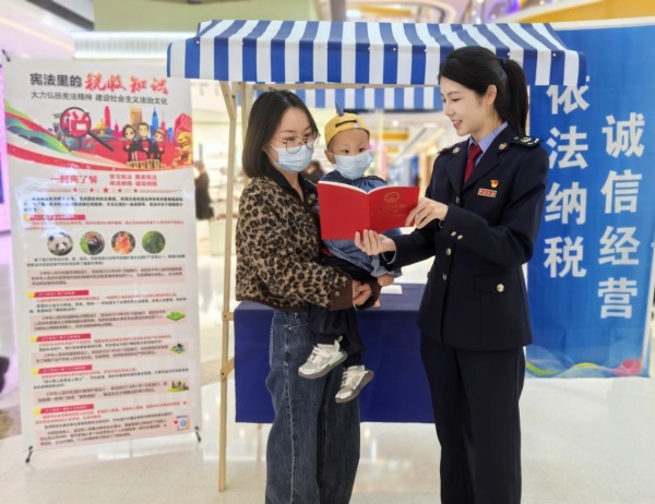 讲解公民权利与义务,解答涉税疑难问题,分享依法维权小知识……活动现场学习氛围浓厚,青年宣传员们用平实亲切的语言,向市民讲解宪法常识、解读最新税收政策。摊位前还有不少年轻的“小顾客”,孩子们被《宪法》鲜红烫金的封面吸引,主动靠近聆听宣传员讲解,在了解到这是“保护大家”的根本大法后,他们纷纷表示要做守法榜样!