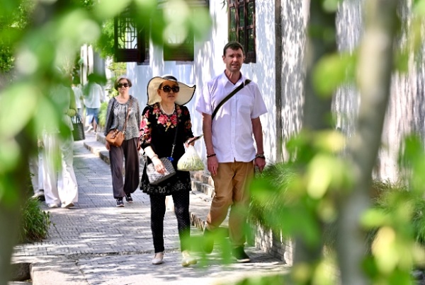 5月3日,外籍游客在昆山周庄古镇游览。朱雄杰/摄