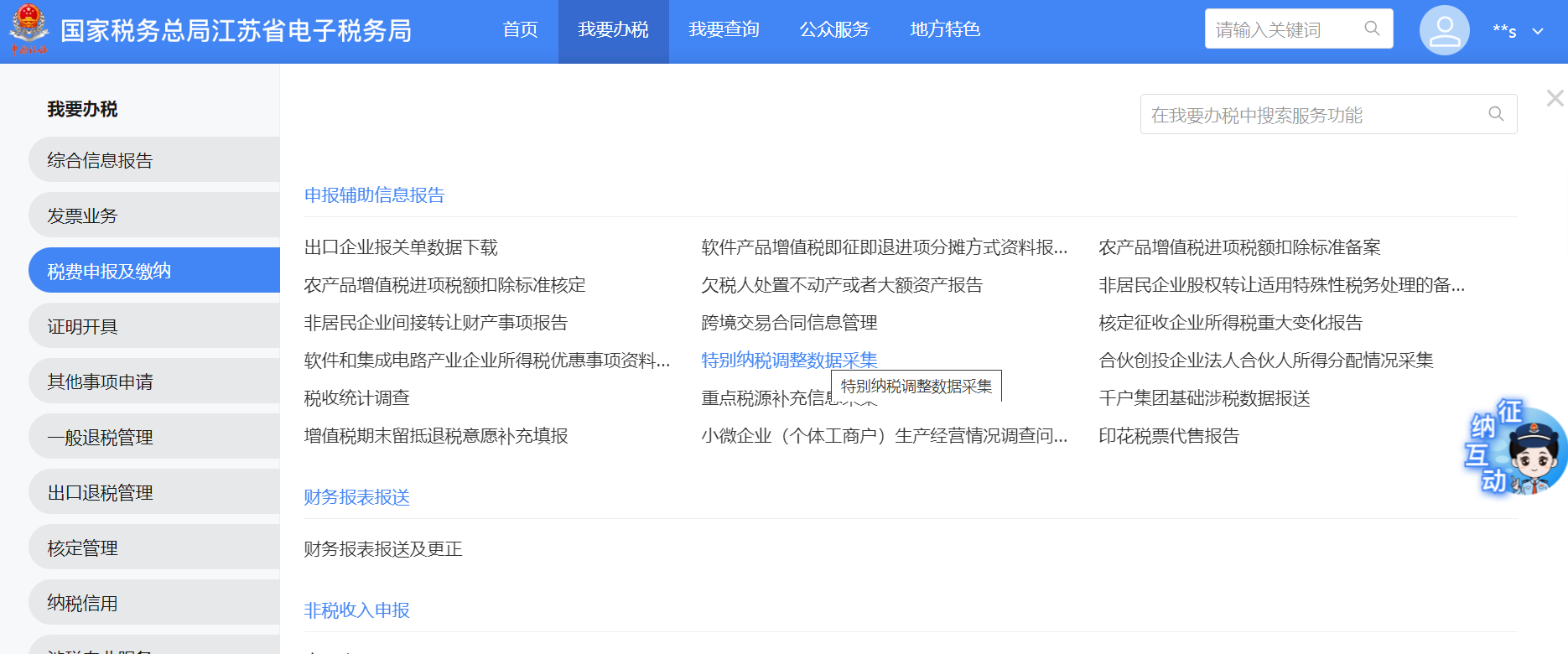 1、园区纳税人登录新电子税务局后,点击【我要办税】-【税费申报及缴纳】-【申报辅助信息报告】-【特别纳税调整数据采集】功能菜单。
