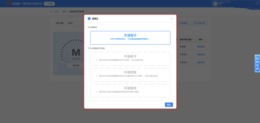 (三)切换年度,可以查看不同年度的纳税缴费信用评价情况,点击申请调整,系统会根据当前年度的纳税缴费信用评价情况,自动推荐可办理事项(申请复评、申请修复、申请复核、申请参评)。例如,对于只符合复评条件的,系统弹出【申请复评】确认框,“可办理事项”为蓝色字体可确定,“不可办理事项及原因”为灰色字体不可确定。经营主体选择复评原因后,提交申请。