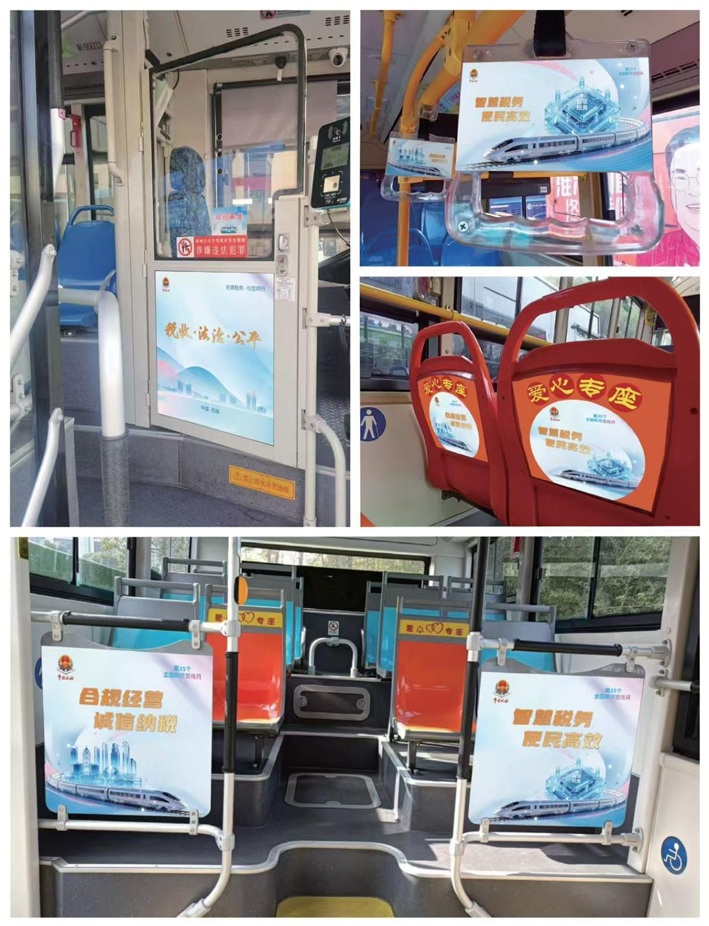活动以无锡市税务局办税服务厅及驻市政务服务中心办税服务厅为辐射点,3个核心地铁站、6个公交候车亭同步上线税收主题海报,百余个城市交通电视屏幕同步滚动播放税收主题视频;多辆公交专线换上“税收新装”,车厢内壁、扶手拉杆、座椅挡板等处均以“税收·法治·公平”为主题,让公共空间成为税收宣传的“移动阵地”。